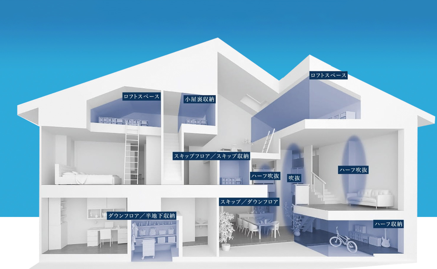 そこで、縦方向の変化が容易である木造住宅の特徴に着目し、高さ1.4m以内の収納を積極的に採用。