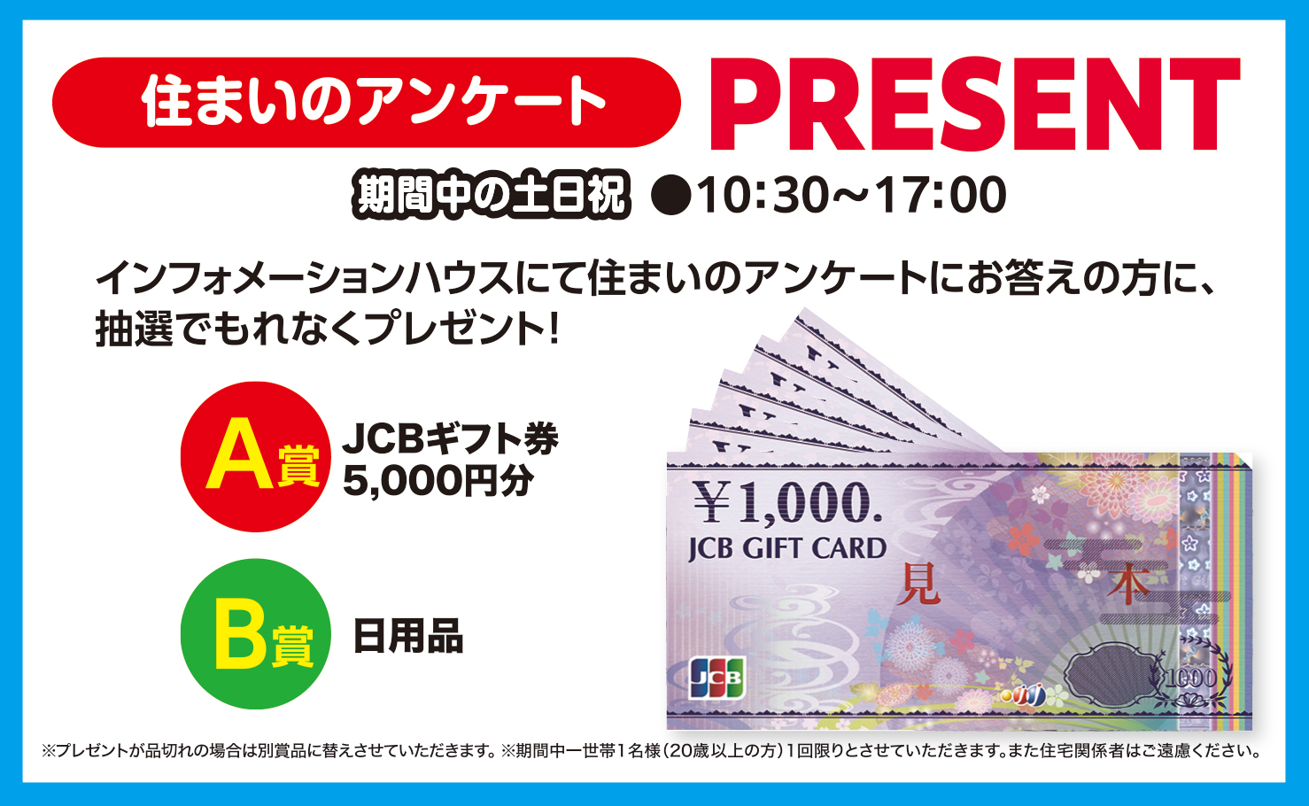 インフォメーションハウスにて住まいのアンケートにお答えの方に、抽選でもれなくプレゼント!