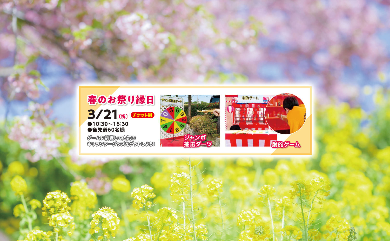 【2023年3月21日(祝)】春のお祭り縁日 2023年3月2日 最終更新日時 : 2023年3月2日 kuramae イベント概要 ゲームに挑戦して人気のキャラクターグッズをゲットしよう! ☆ジャンボ抽選ダーツ☆射的ゲーム ●日程:3/21(祝)●時間:10:30~16:30●参加:各先着60名様 ※チケット制