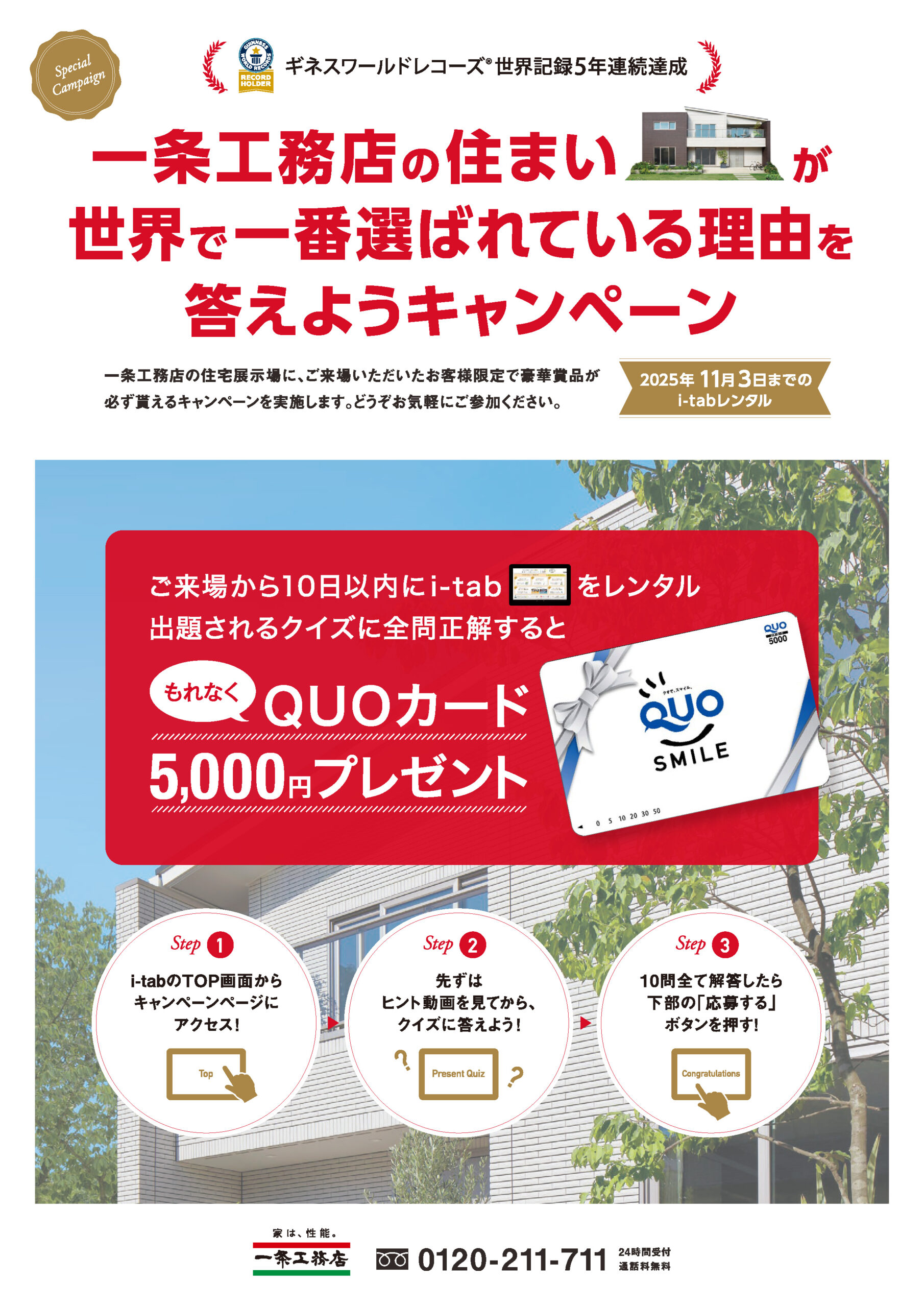 【一条工務店】電子カタログレンタルで5000円分クオカードプレゼント🎁 2025年10月7日 最終更新日時 : 2025年10月9日 child ご来場から10日以内のタブレットレンタル&クイズ全問正解でクオカード5000円分がご自宅に届きます! ご来場お待ちしております! ご予約はこちら