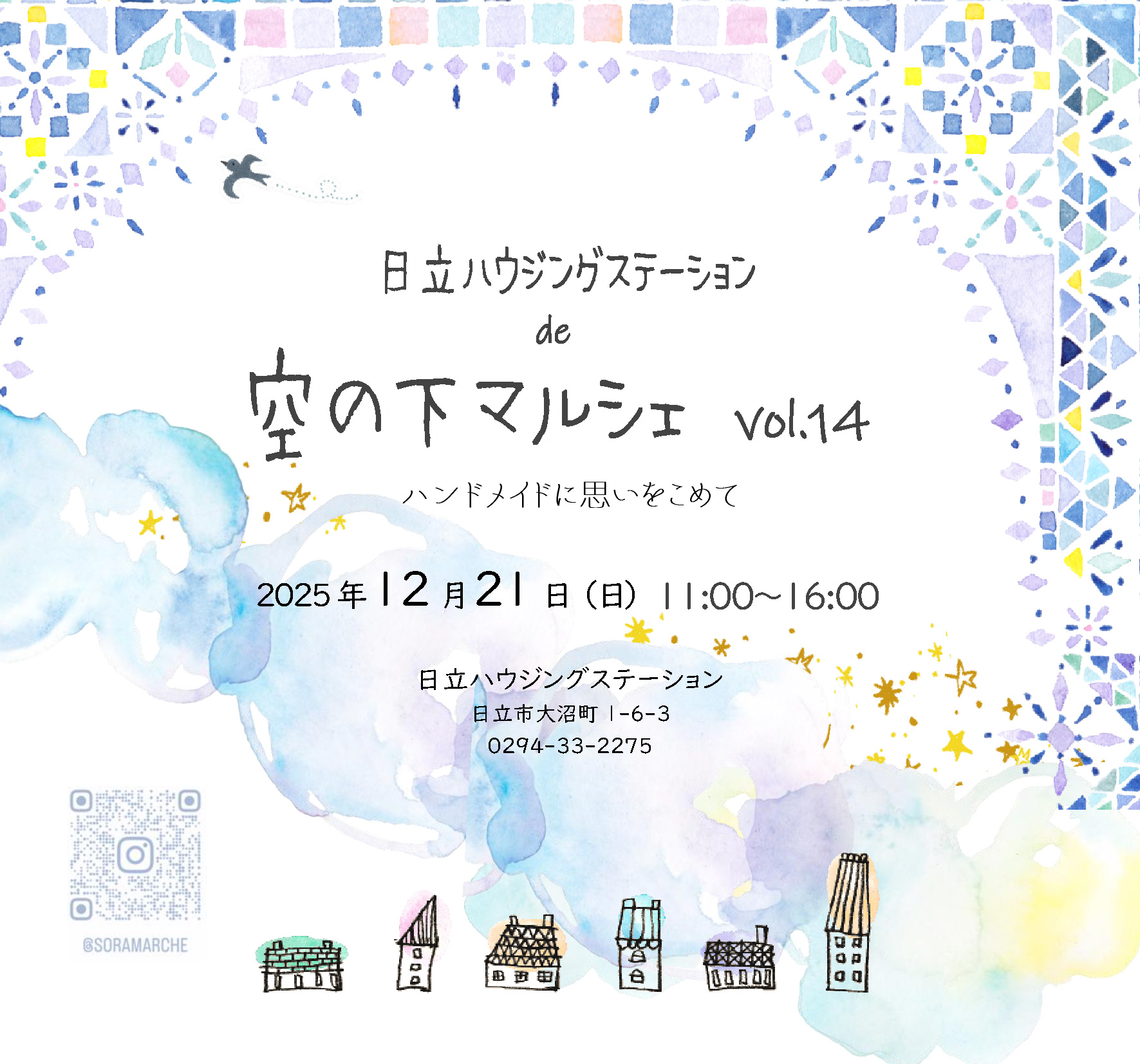 【2025年12月21日(日)】空の下マルシェ vol.14 2025年11月25日 最終更新日時 : 2025年11月25日 child ハンドメイドに思いをこめて ●日程:12/21(日)●時間:11:00〜16:00 ※会場:日立ハウジングステーション(茨城県日立市大沼町1-6-3)※お問い合わせ:0294-33-2275