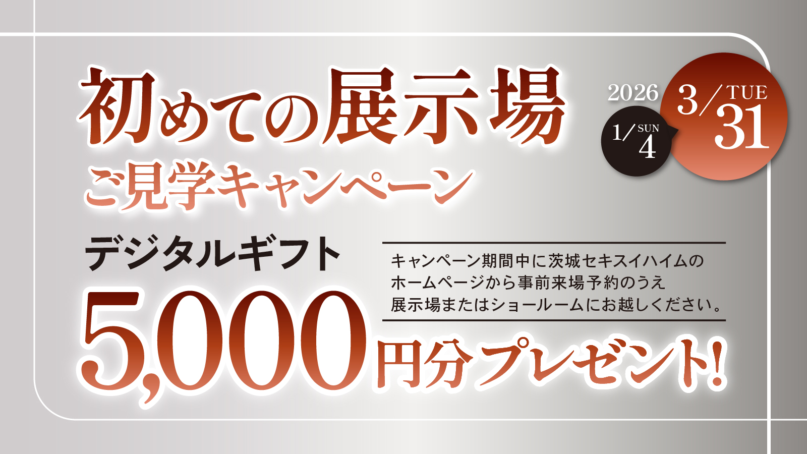 期間中、茨城セキスイハイムのホームページから事前来場予約のうえ、ドマーニ日立展示場にお越しいただくと「デジタルギフト 5,000円分」をプレゼント!