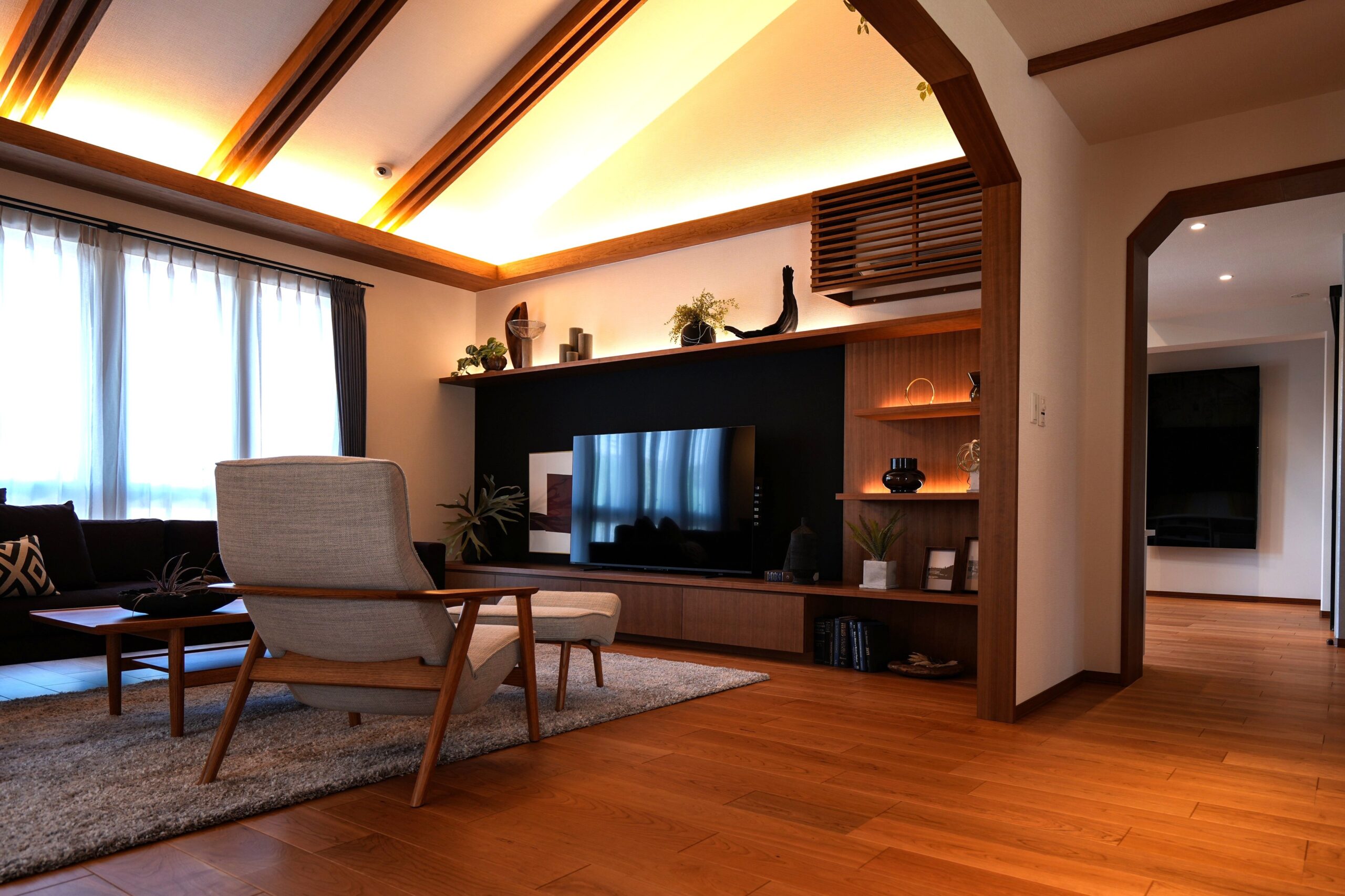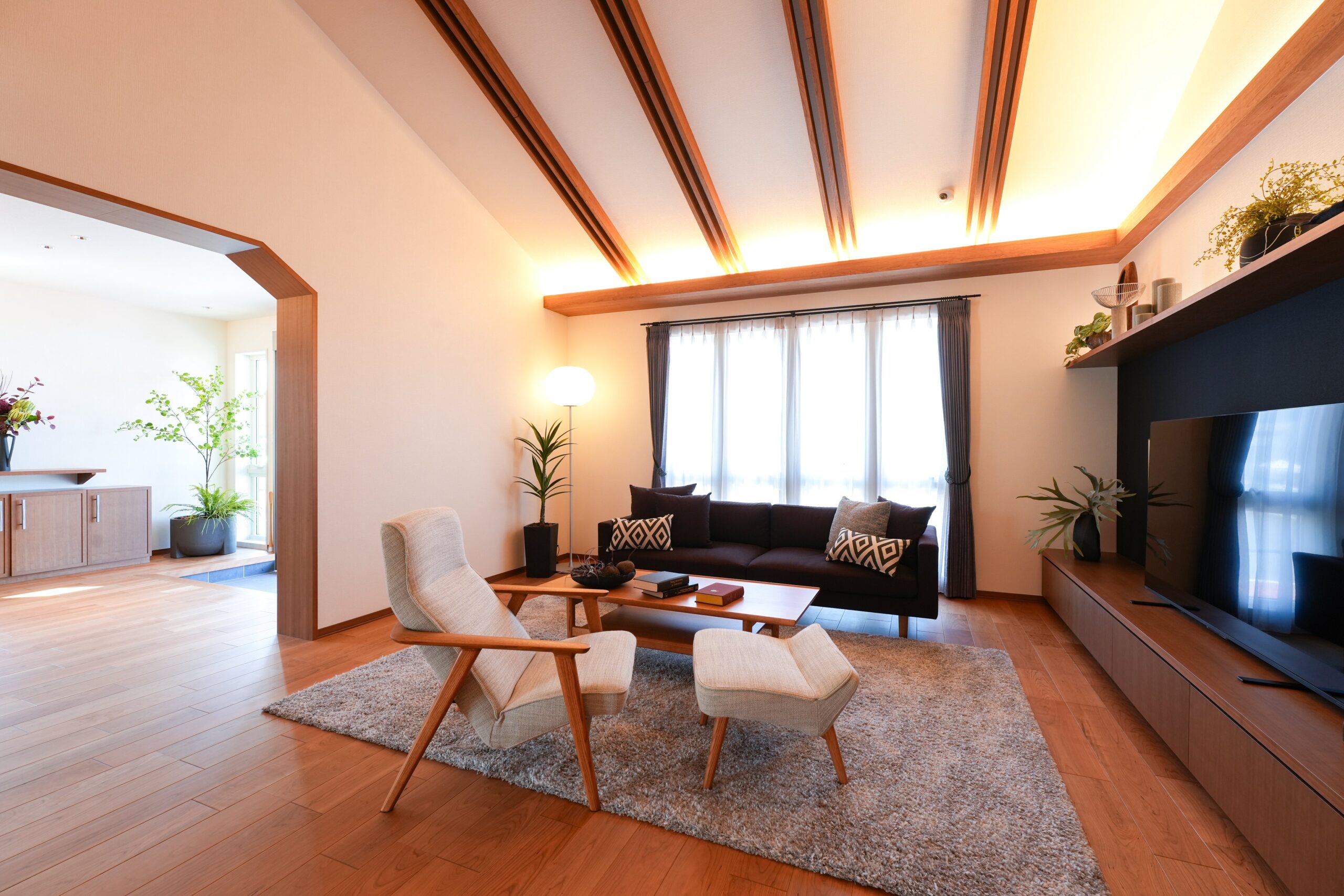 シンプルで洗練されたインテリアに、天井の美しい梁と間接照明が映えます✨